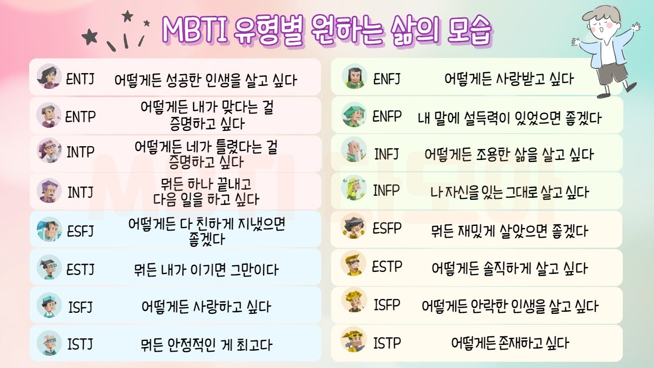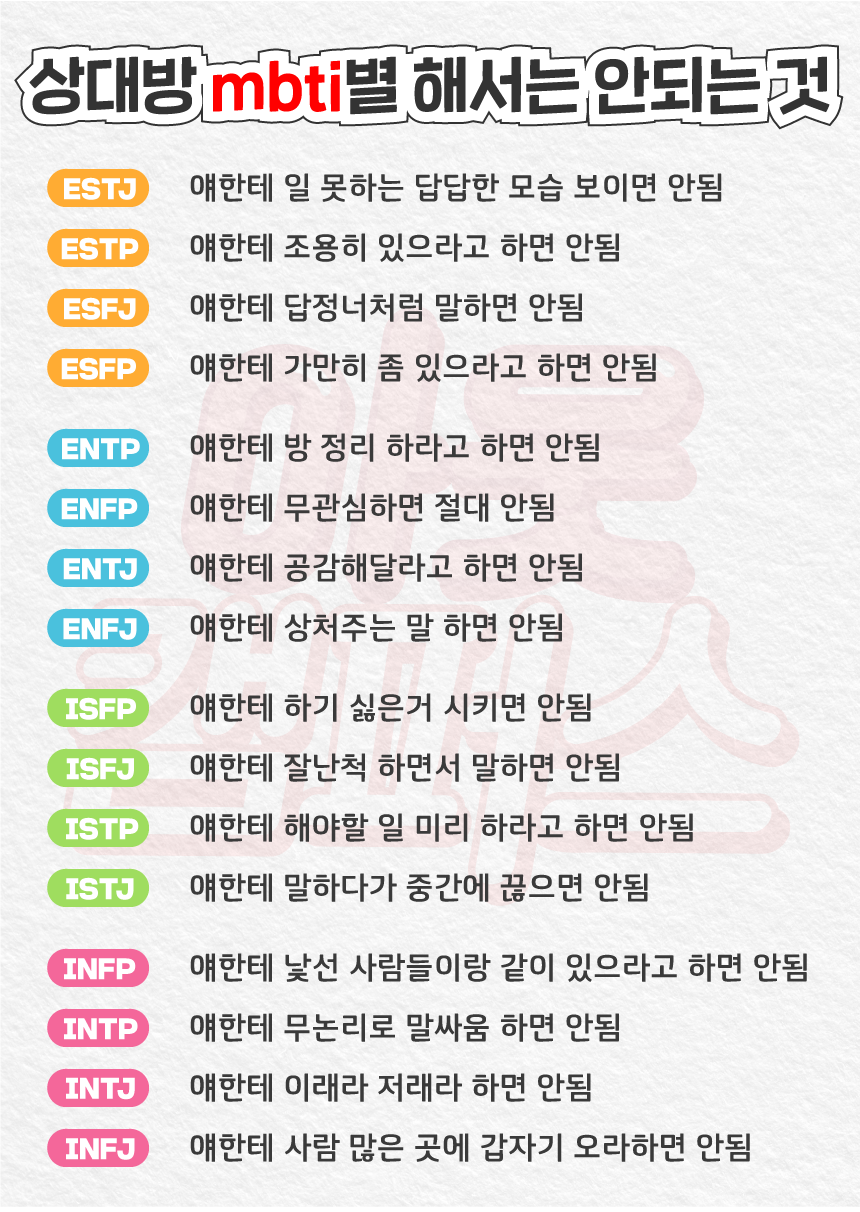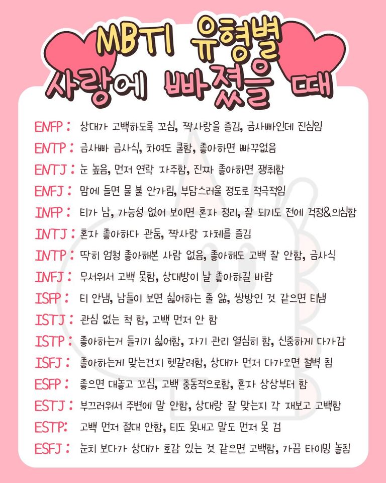 MBTI가 국내에서도 유행하면서 다양한 파생 콘텐츠들이 만들어졌는데요. 예를들면 궁합, 상황별 성격 특징, 한줄평 등이 있습니다. 워낙 많은 자료들이 있다보니 본인과 친구들의 mbti만 잘 기억해두면 이런 콘텐츠들을 모두 즐길 수 있습니다.