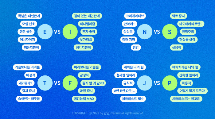 아래 내용만 잘 숙지하셔도 본인 MBTI가 자신과 잘 맞게 나왔는지 자가진단 해볼 수 있습니다.