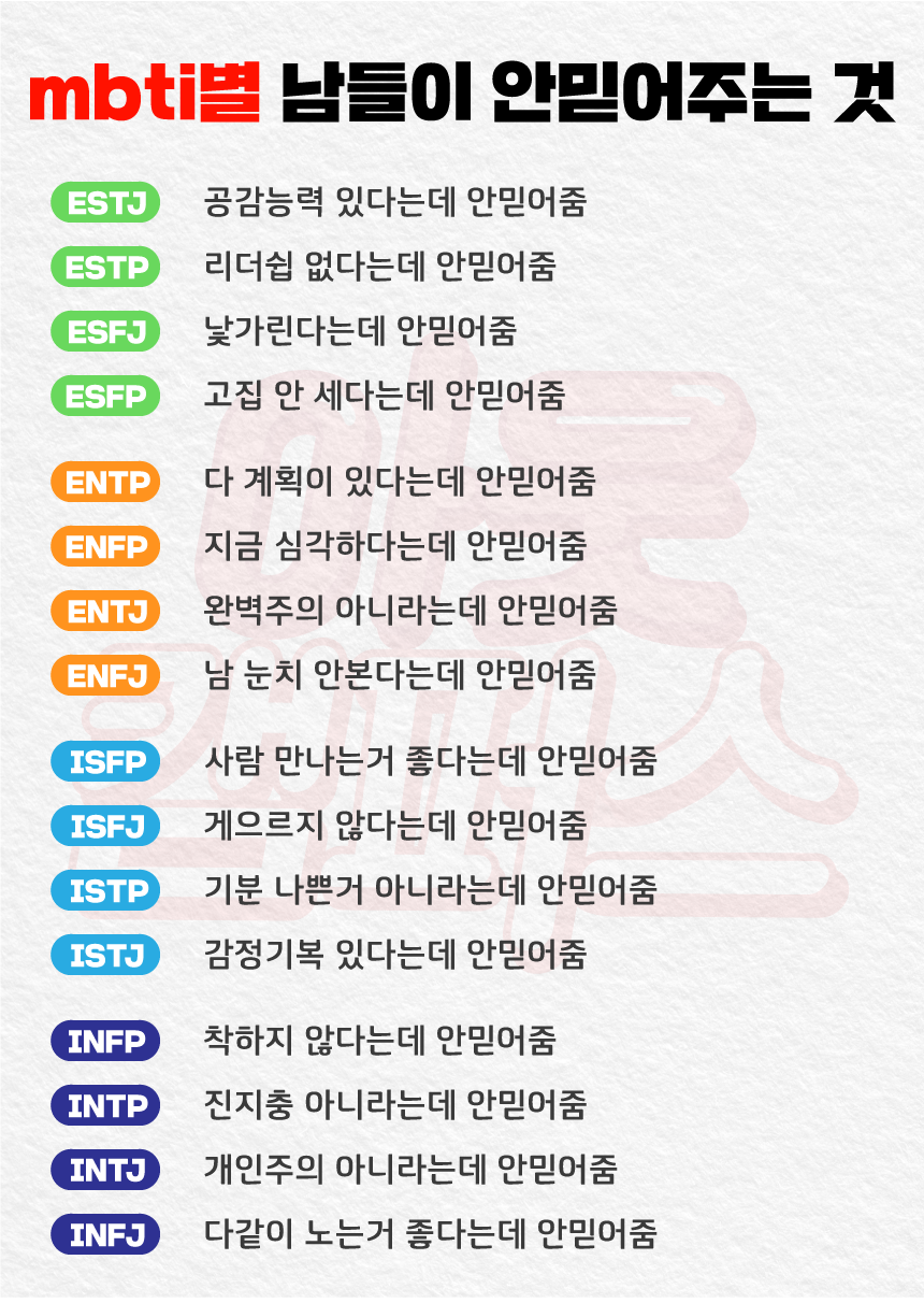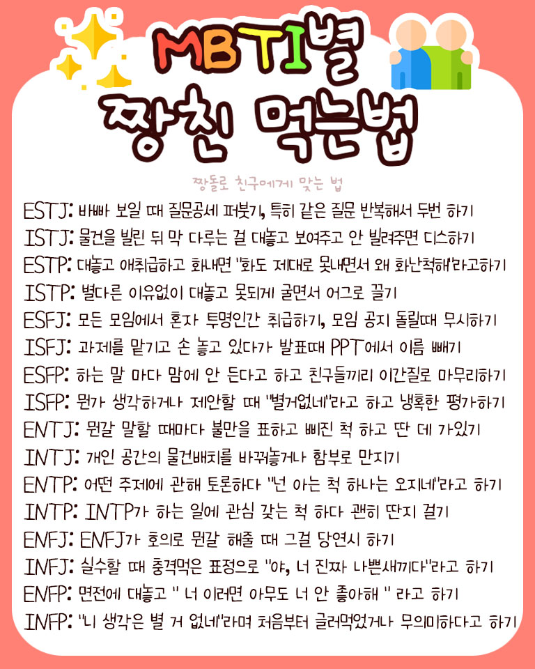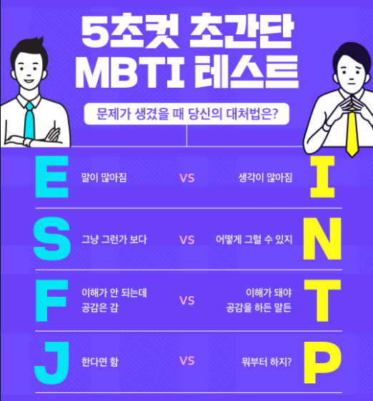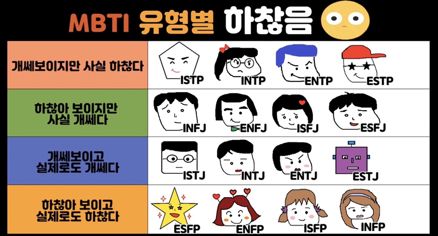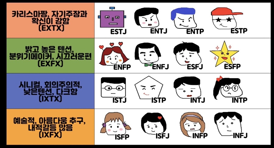 하지만 실제로 mbti가 대세가 된 만큼 요즘 본인이 어떤 타입인지 모르면 아싸가 되거나 모임에서 순간 벙어리가 되는 경우도 있기 때문에 알아둬서 나쁠것 없겠죠.