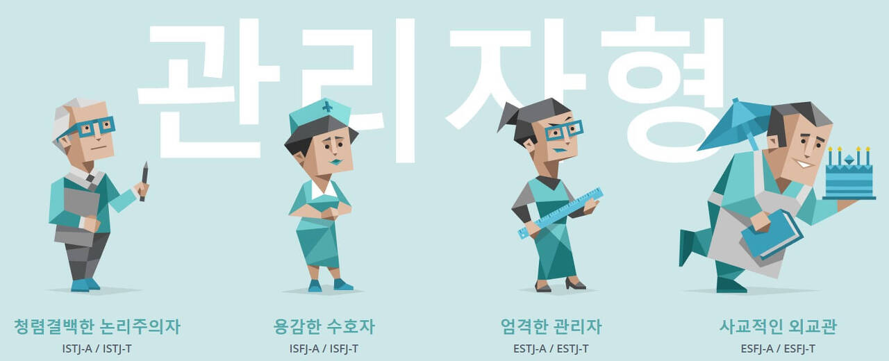 - ESTJ(엄격한 관리자) : 사물이나 사람을 관리하는 데 뛰어난 실력을 갖춘 관리자형