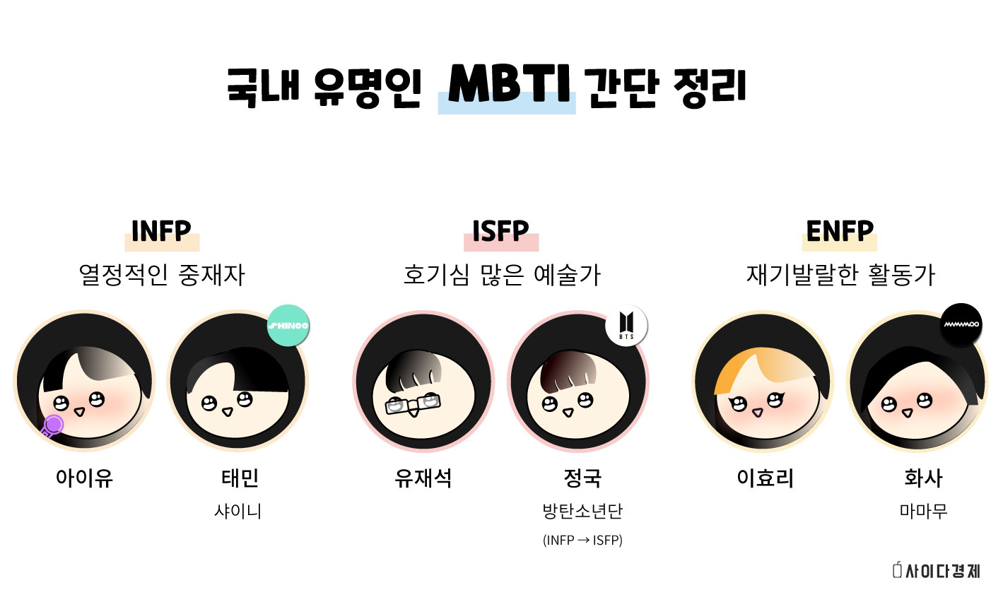 - ISFP(호기심 많은 예술가) : 늘 새로운 도전과 시도를 하는 것을 즐기며 융통성 있는 성격의 매력 넘치는 예술가형