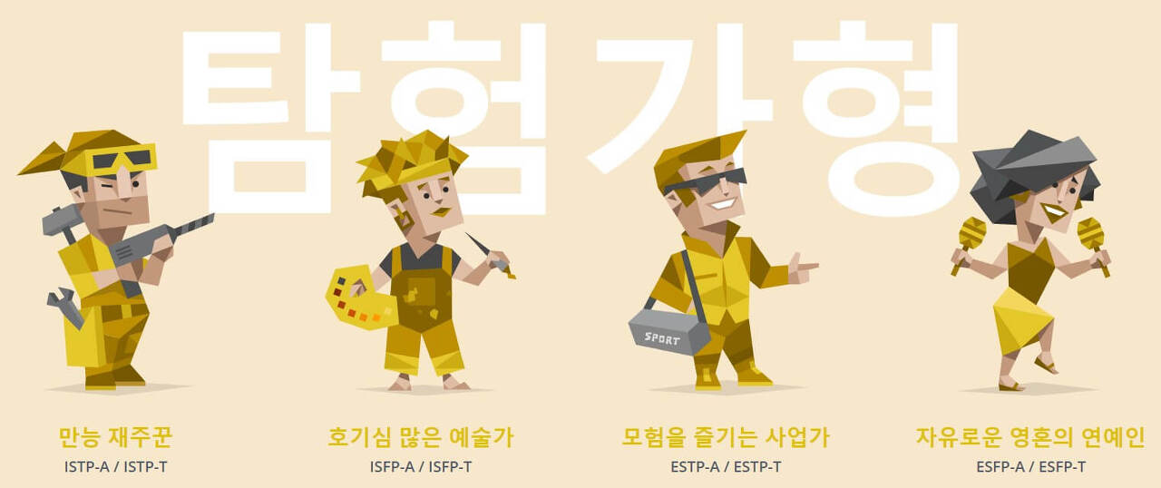 - ISTP(만능재주꾼) : 대담하지만 현실적인 성향으로 다양한 도구 사용에 능숙한 탐험형