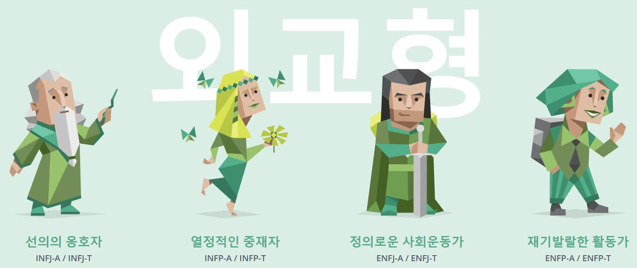 - ENFP(재기발랄한 활동가) : 긍정적인 성격으로 사람들과 자유롭게 어울리기를 좋아하며 창의적이고 항상 재밌는 것을 찾아다니는 무한 열정의 소유자