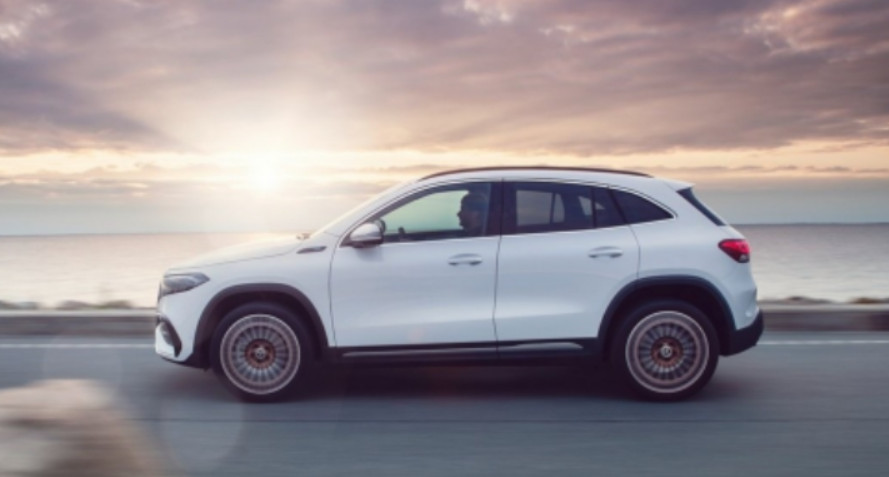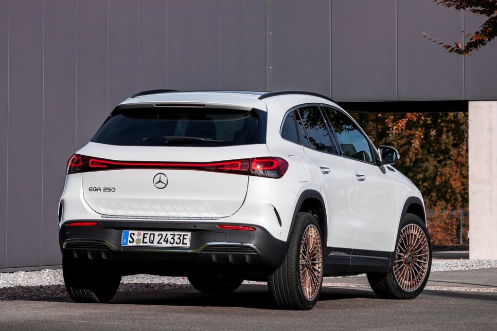 측면부 역시 GLA와 디자인이 비슷합니다. 18인치 5스포크 경합금 휠이 들어갔습니다. 전기 충전구도 측면에 위치했는데요. 일반 주유구의 위치처럼 오른쪽 뒷편에 위치하고 있습니다. 유려하게 내려오는 루프라인과 리어 범퍼 사이드에 에어 브리더가 적용되어 한층 더 날렵한 모습을 보여줍니다.