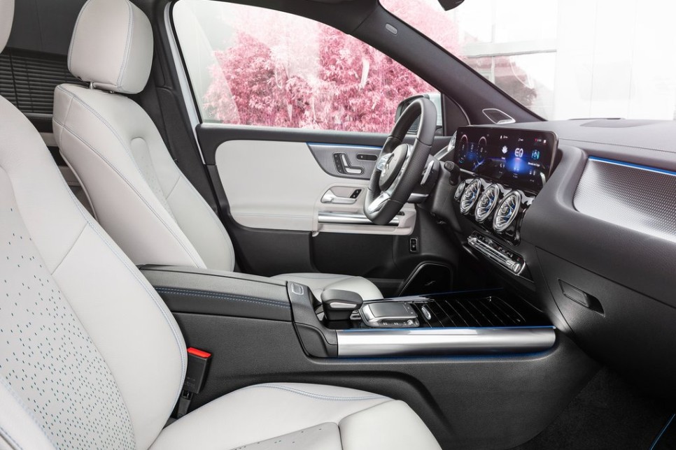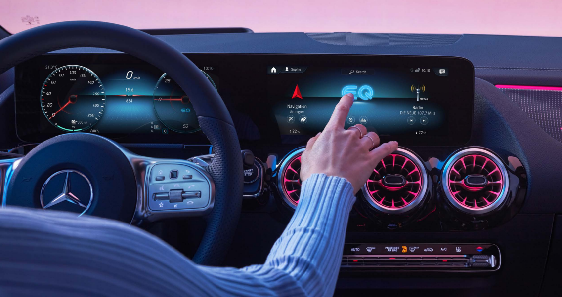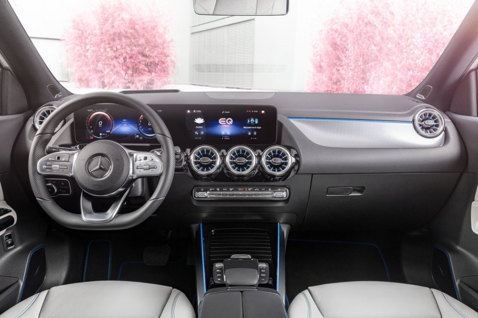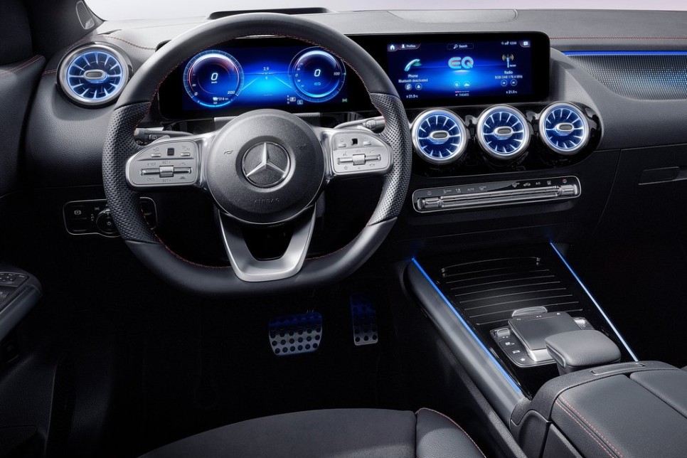 실내에는 2개의 7인치 디스플레이와 선택가능한 2개의 10.25인치 디스플레이를 통해 30 와이드 스크린 콧핏이 적용되었습니다. MBUX 인포테인먼트 시스템이 탑재되어 대영 터치스크린 디스플레이와 함께 음성 인식으로 제어 가능합니다. 앰비언트 라이트는 총 64가지 색상을 사용할 수 있습니다.