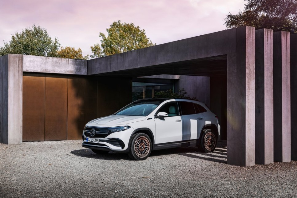 측면부 역시 GLA와 디자인이 비슷합니다. 18인치 5스포크 경합금 휠이 들어갔습니다. 전기 충전구도 측면에 위치했는데요. 일반 주유구의 위치처럼 오른쪽 뒷편에 위치하고 있습니다. 유려하게 내려오는 루프라인과 리어 범퍼 사이드에 에어 브리더가 적용되어 한층 더 날렵한 모습을 보여줍니다.