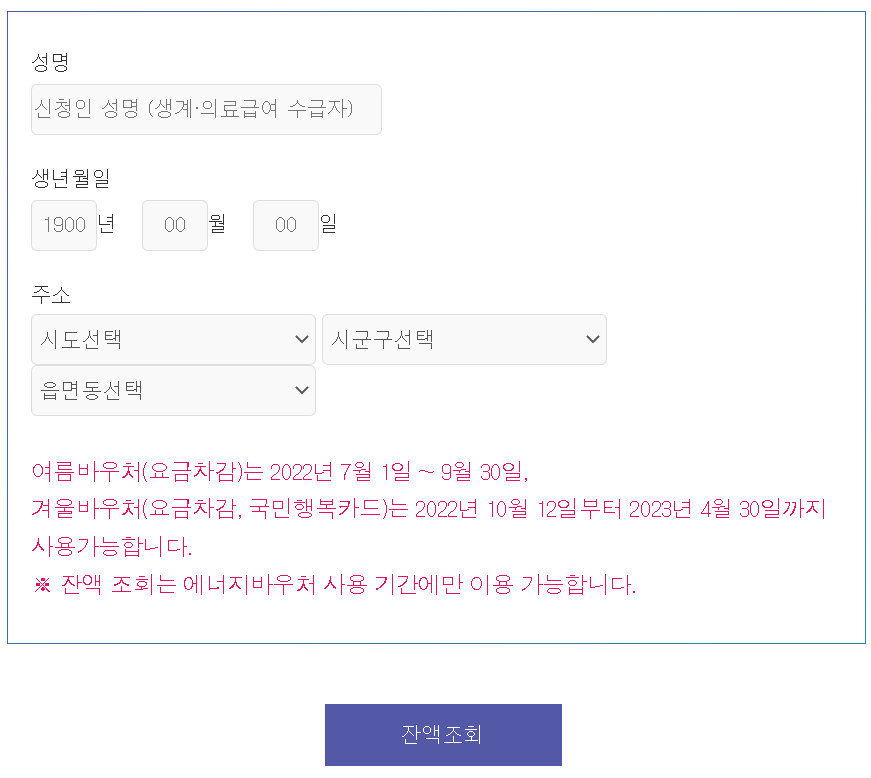 사용하시다보면 에너지 바우처에 잔액이 궁금한 순간이 꼭 오는데요. 그 때는 위 홈페이지에서 잔액 조회를 하시면 됩니다. 성함, 생년월일, 주소만 입력하셔도 잔액조회가 가능합니다.