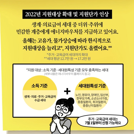 올해 2차 추경안 발표 결과 에너지 바우처 대상이 확대되었는데요. 이번에 주거·교육급여 수급가구가 추가되었습니다. 이로 인해 훨씬 더 많은 사람들이 지원을 받을 수 있게 되었습니다.