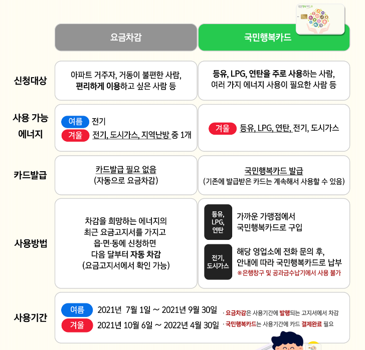 - 국민행복카드 : 등유, LPG, 연탄, 전기, 도시가스 모두 사용가능합니다.